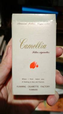 老版本的茶花细支烟,包装很典雅。“茶花”是云南省花,这两字复刻自唐伯虎的手迹,纯白盒子上,一抹含苞待放的红色茶花点缀下,紫光灯一照,花蕾会变成倩丽的少女头像,像极了一位优雅恬静的少女,清丽、高雅、柔情!